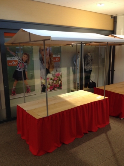 Mit weißem PVC-Dach und roter Stoffschürze.
