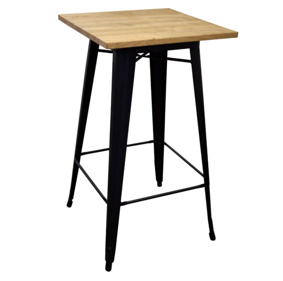 Deze statafel heeft een mooi zwart onderstel met een houten blad.