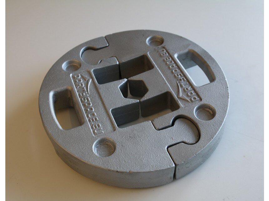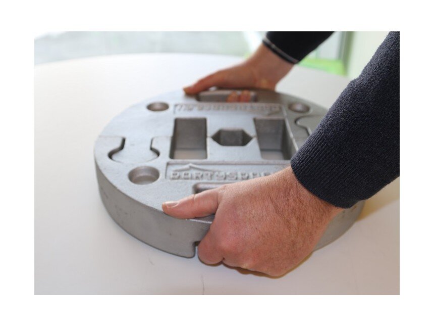 Rond elke poot komt één gewicht. Het volledige gewicht bestaat uit twee puzzelgewichten die gemakkelijk om de poot heen in elkaar passen.